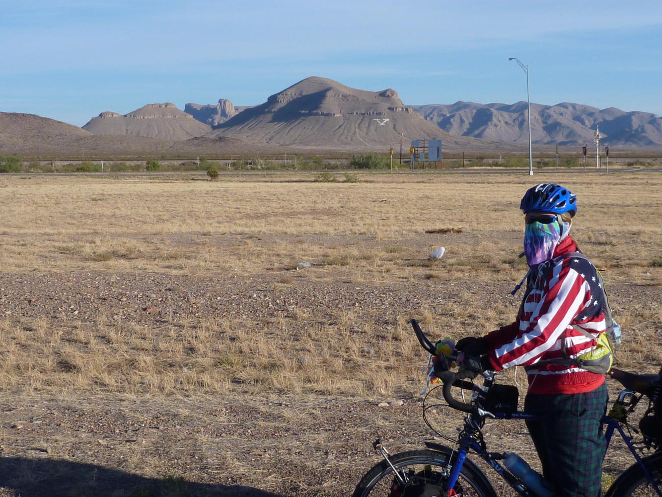 We left Van Horn early hoping to make it to El Paso. We started on the ACA route of riding I-10 for 13 miles before changing over to frontage roads. I-10 has a large, smooth and clean shoulder so we decided to stay. The view was all mountainous and was quite spectacular. There were two other touring bikes headed east. Traffic was light. We stopped for lunch in Fort Hancock then continued with the rolling interstate. I had problems with shifting my chainwheel in 3rd (the largest gear). There is a plastic wheel that attaches to the outside gear and seems to keep the chain from going over when shifting. This broke early on so every time I wanted to pick up speed I stopped and manually shifted the chain. This worked out well and we made good time. We stopped in Clint, Texas right at sunset and found a nice motel. I zip tied the plastic wheel in place and it seems to work. I talked with a fellow crazyguy and found out that there is an adjustment to keep the chain from going over the large gear. I learn something every day! Tomorrow we plan to be out of Texas!