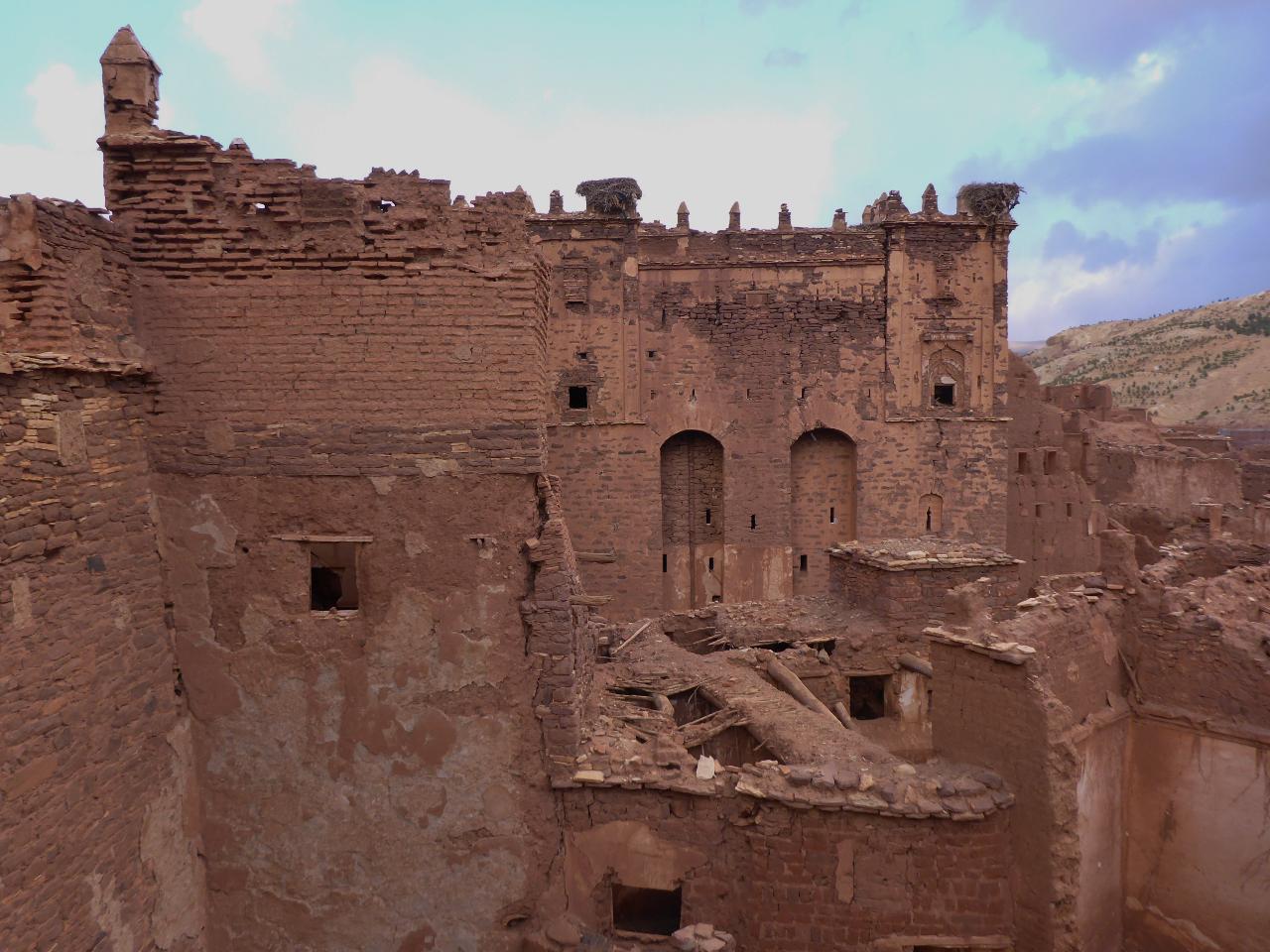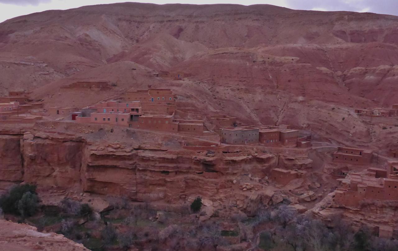 After a few miles I started climbing into a fierce wind and was knocked down twice. I plodded along and finally reached the next village of Telouet and found Jocelyn and Abraham waiting for me. Jocelyn’s pedal was on so we continued to 17th century Kasbah Telouet. I really like history and old architecture so this was a real treat. We continued along a beautiful rocky valley to our destination for the night at an old Berber Hotel in the town of Alt-Benhaddou.