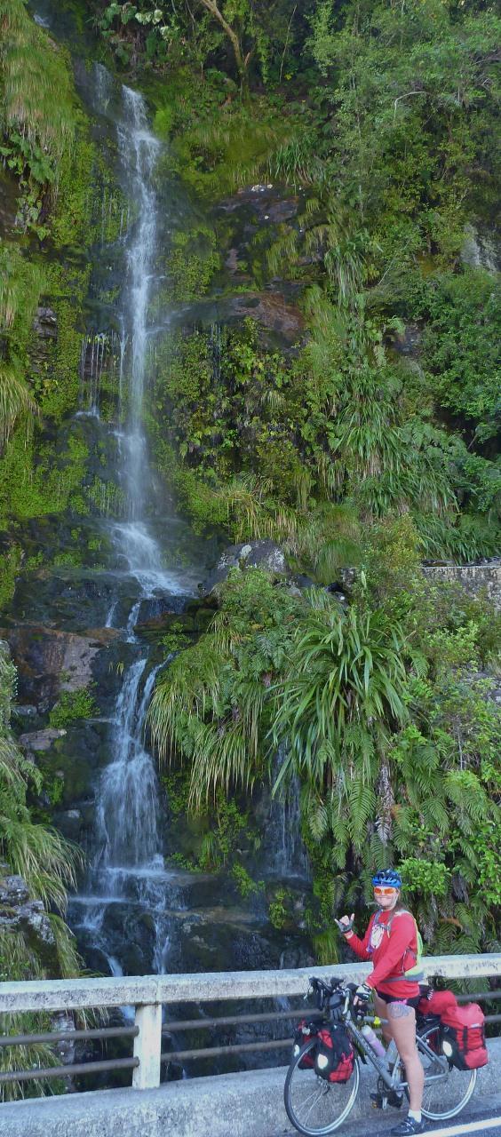 Last night we had a good dinner and rest as we knew Haast Pass going to Otago Valley was known as “the wrong way” because of the steep climb. The first 25 miles were fairly easy with the usual ups and downs but then the steep climbing started. The views were just amazing and this ride is known as one of the most beautiful in all of New Zealand. Riding through a rainforest along the Haast River surrounded by snowcapped mountains with a waterfall around every curve was just awesome. This has got to be one of the most beautiful rides in the world. The challenge of the climb just made it more awesome. The climbing soon turned to an occasional walk and the true meaning of what Kiwis call a “push bike” came through. We have climbed higher here but not as steep.