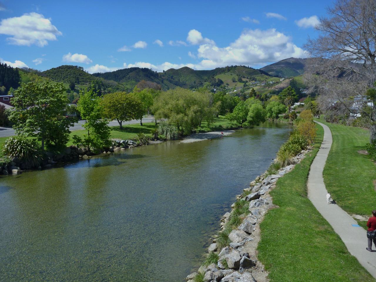 We arrived at the bus station in downtown Nelson. As I was reinstalling my front wheel I heard a voice, “Can I help you with that?” I looked up and it was my friend Dan from the ice – unbelievable! He and his wife Karen are driving around New Zealand for a month and they just happened to be where the bus stopped. We chatted for a while then Jocelyn and I loaded up the bikes and found our motel for the next two nights. It is close to downtown and overlooks the Maitai River.