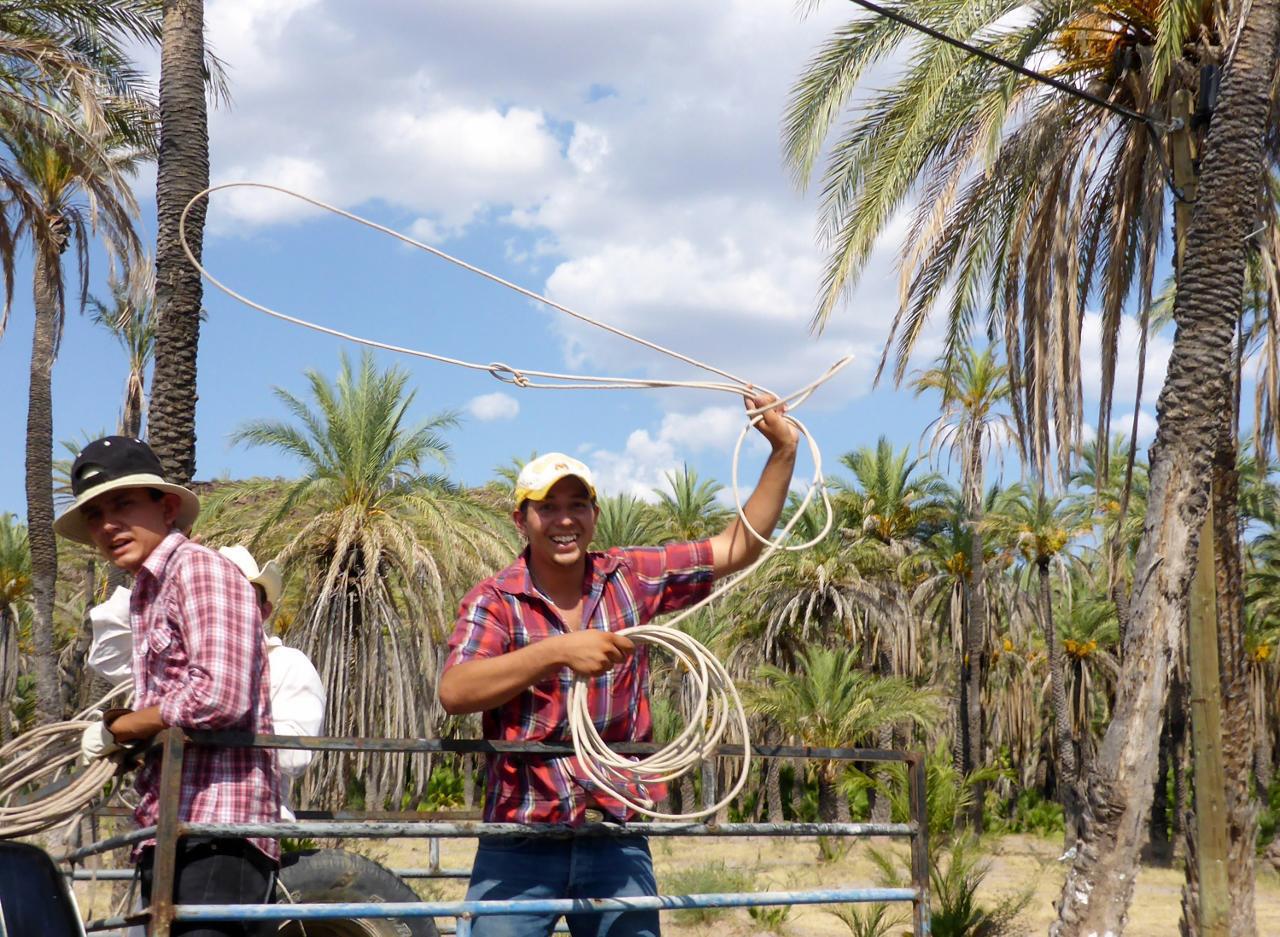 After a delicious breakfast of oatmeal and fruit we got an early start trying to beat the heat. At one point we rode into a thunderstorm and received about 9 cooling drops of rain. Then it turned humid too. It is still not as hot as last summer when we rode through the Iranian deserts though. At that time it was in the 130’s f and Jocelyn was completely covered. After several hours we entered the town of San Ignacio and found delicious fish and shrimp tacos in the “Rice and Beans” Restaurant. This place is also a hotel with pool but the quoted price was too high. We have been paying about $24 a night with large rooms. The proprietor then offered us a room for $30 and we took it because it had a pool. We had heard of Mission San Ignacio and wanted to explore that so after lunch we once again stripped our bikes and took a cycling tour of Mission San Ignacio and the town. San Ignacio is near a river that has water so it seems like an oasis in the desert. At times we thought we were back in Morocco and at other times it reminded us of Thailand. After our tour we had a great swim in the hotel pool. Tomorrow we continue east through the desert to the Gulf of California. We are ready for camping on the beach and surfing.