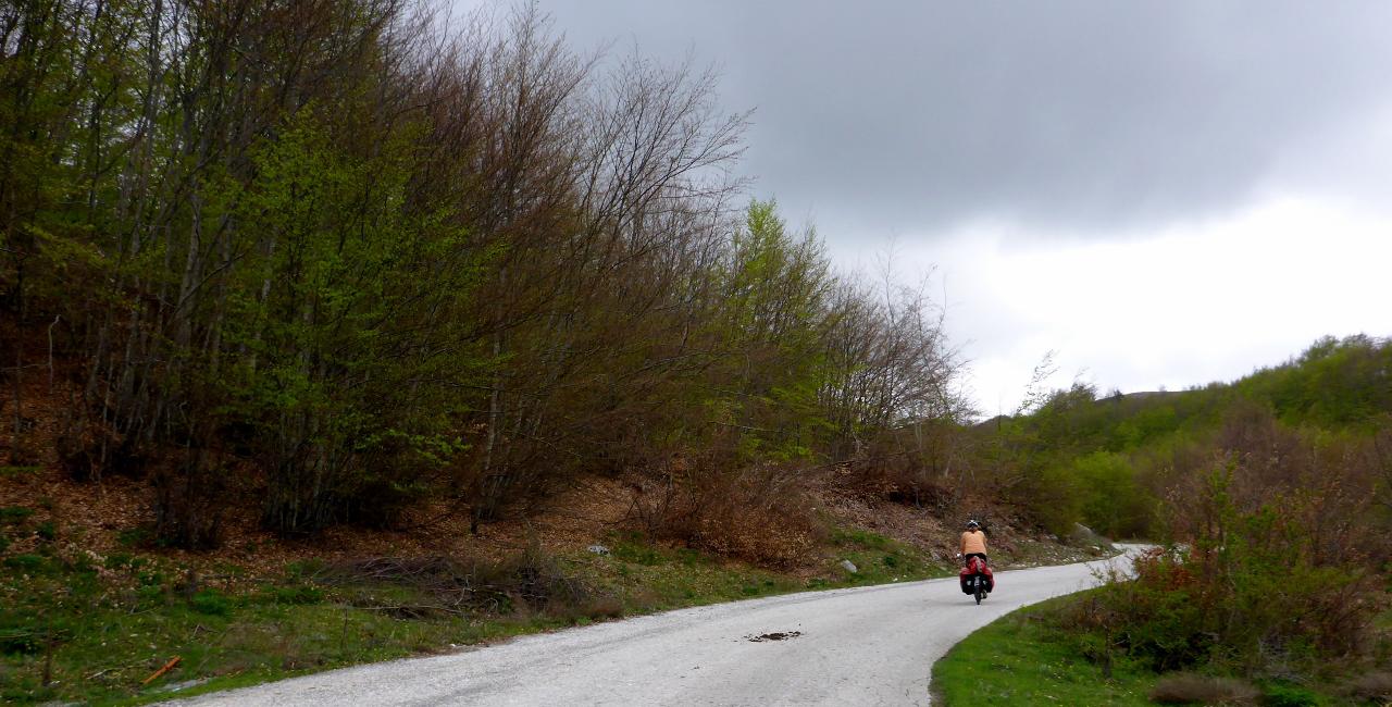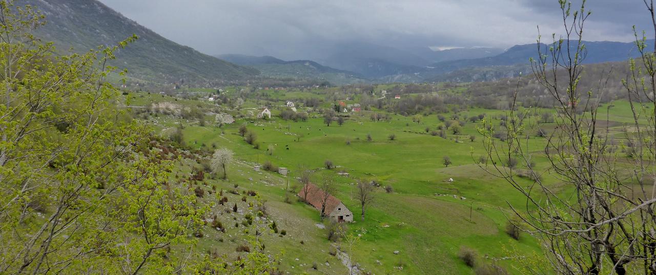 May 2, 2014 32 miles We left Niksic expecting more rain and slowly climbed to the local ski area. The weather was sunny then cloudy then sunny so we were continually taking our rain gear on then off. The views were beautiful as we rode along the sparsely snowy roads. The riding was full of stunning scenery. It was classic European hairpin turns and climbing that we were really enjoying until a spoke popped through and slashed the rear tube. Another spoke and wheel problem. My bike was still jumping badly when using the rear brakes and Jocelyn’s chain was jumping around on her gear cluster. Near sunset the puncture happened but after changing the tube my rear wheel was pinging badly. We limped into the town of Savnik asking for accommodations since it was near sunset and were told 3km then turn left. We checked with a few others to confirm the same direction. At this point my wheel was sounding really bad so I told Jocelyn that I was walking because I didn’t want to ruin my rim and to cycle on ahead. For this 3 km climb oncoming traffic was honking and waving probably thinking this guy can’t climb. But I smiled and waved back and continued walking and at the top was Jocelyn waiting and she had rented us an a-frame cabin for the night. Nice job! What a relief as it was perfect and dark and there was a restaurant on premises.