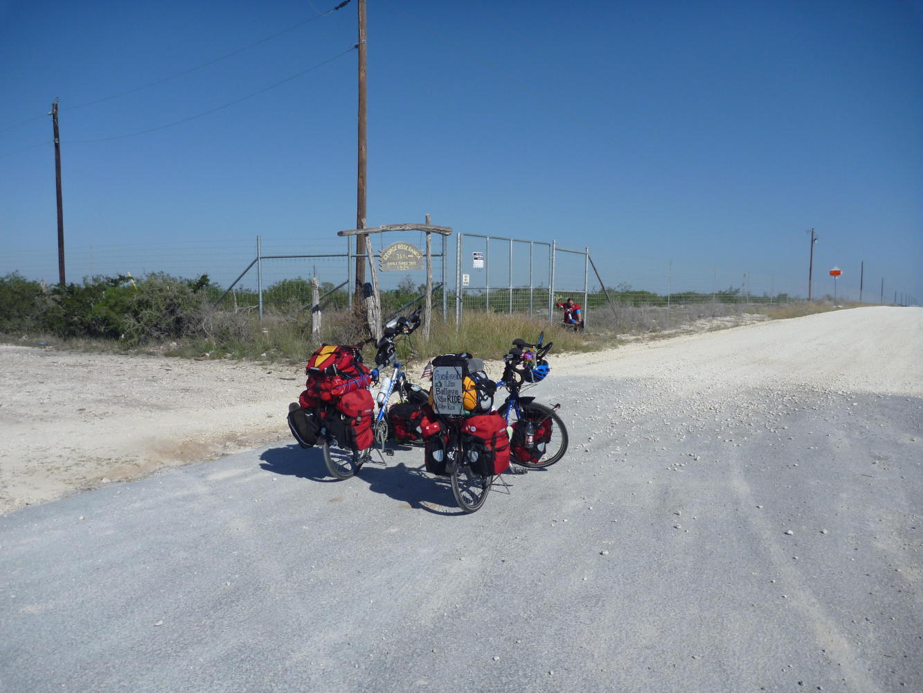 We rode out of Uvalde early to find another nice countryside. At first the road and shoulder were smooth but it slowly turned rough and bumpy. Then the hills appeared and the ride became a continuous up and down with a vibration from the bumpy shoulder. Traffic was light so we rode on the road whenever possible. We found out later that many of the Texas roads are made of chip-seal. Tar is spread out then pebble or larger sized rocks are thrown on top. These rocks stick to the tar (and from what we heard not even steamrolled over) and that’s the road. Over time the tar shrinks away leaving a very bumpy surface. The rocks are still embedded but not covered. It gets to be that even your teeth are rattling! We did pass several work crews reworking the roads with regular asphalt.