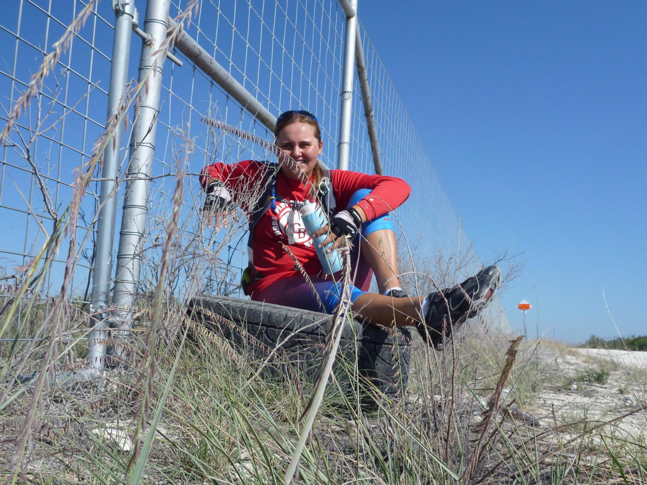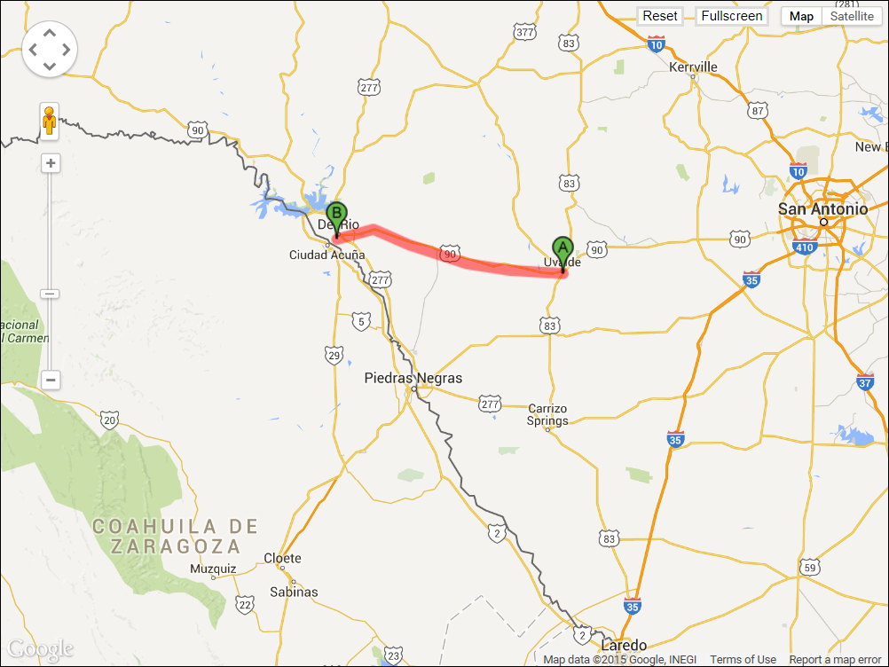 We stopped for lunch in Brackettville and had you guessed it – tacos! Fueled with that we pulled into Del Rio after 74 miles in 8 hours. It was a hot one though and both of us ran out of water right before Del Rio. Jocelyn carries 3 24 oz. bottles along with a 70 oz. hip pack. I carry 2 24 oz. bottles with a 100 oz. backpack.