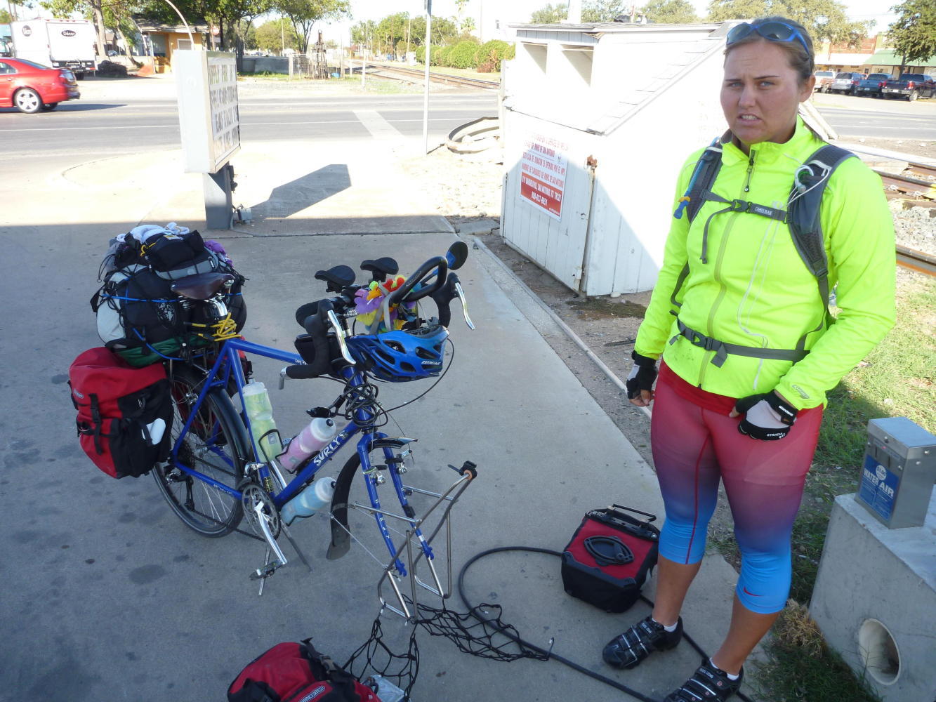We started our day at Mr. Taco in Luling for breakfast. We have noticed that a lot of Mexican restaurants are open for breakfast. We each had the huevos rancheros to fuel our days ride. Excellent! As we rode out of town we noticed that Jocelyn had another front flat. So we pulled over and saw that she had picked up another wire from a shredded roadside tire. Lots and lots of shredded tires litter the shoulders and with it are lots of steel wires. She is running Continental Tires that aren’t as thick as my Schwalbes. So this was our second flat. When we returned to our bikes at a Port St. Joe Florida storage facility her rear tire was flat so I changed out the tube. We had filled that tire with CO2 much earlier. We later learned from a bike shop in Panama City that if you fill a tire with CO2 it eventually permeates out of the tube so it must be refilled with air. I never knew that. So it wasn’t really a flat.