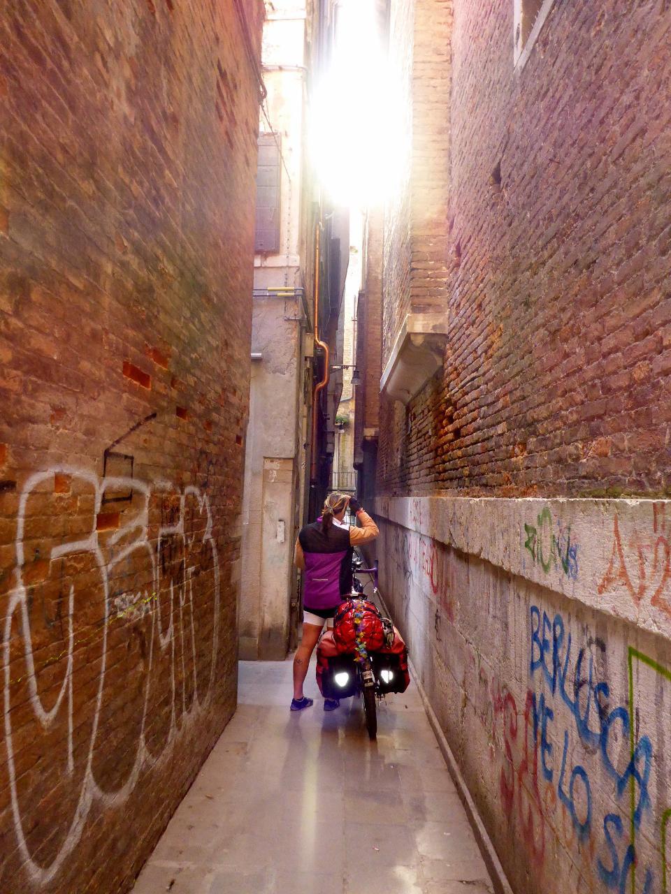 April 14, 2014 Train Ride The strike was over so we trained to Venice. We immediately found out that Venice is not a town to cycle in due to crowds and pedestrian bridges connecting the numerous islands. So we quickly found a hotel, stored our bikes, and then spent the rest of the day and night having fun as a tourist. Venice is simply a spectacular city on the water.