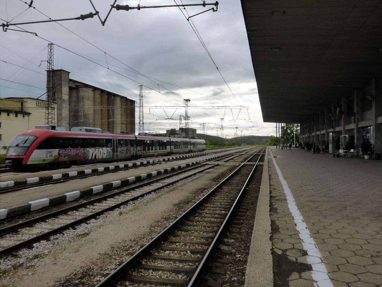 May 15, 2014 67 train and 42 miles bicycle We were up early as usual but I failed to recognize the time change since moving into Bulgaria. We had decided to take the train from Vratsa to Sofia because we want to visit the Greece coast before Istanbul and time is short. The train was scheduled to leave at 8:39 but my computer and watch were an hour off. Jocelyn fortunately knew the correct time so we quickly left our apartment and arrived at the train station in plenty of time. Thanks Jocelyn. When the train arrived Jocelyn immediately called it the “scary train” as evidenced by the pictures. It quickly arrived and without the kind help of others we could not have loaded our bikes on time as it left quickly. It was scary and fast as the conductor barked out his orders. We loaded out bikes into different cars and stood by each for the 1 hour and 50 minute 67 mile trip. We would have liked to sit and watch the beautiful countryside pass by but we were busy moving each bike as passengers wanted to use the stinking WCs (water closet). What a mess!
