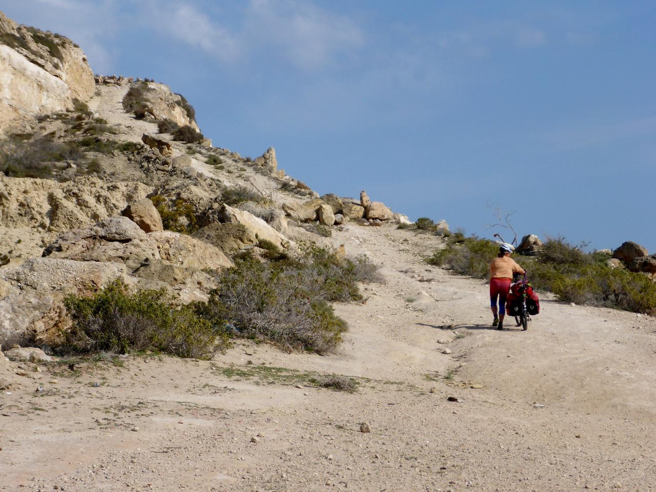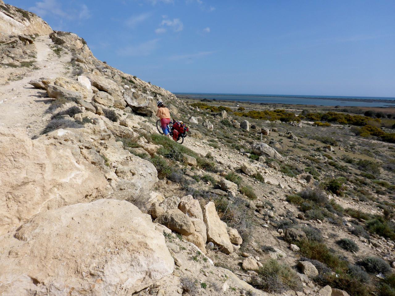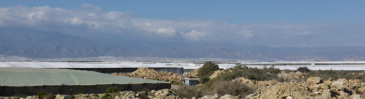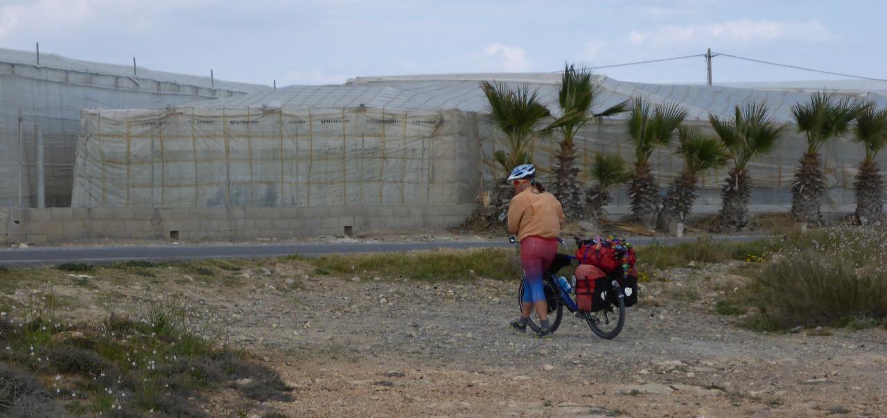 March 12, 2014 39 miles We climbed out of El Pozuelo and continued along El Mar de Plastico, the sea of plastic. This area of the coast is full of greenhouses growing fruits and vegetables for the northern European market. It really detracts from the beautiful coast. The gusty wind continued and we fought for every mile until it was late once again and we stopped in the town of Almeria.