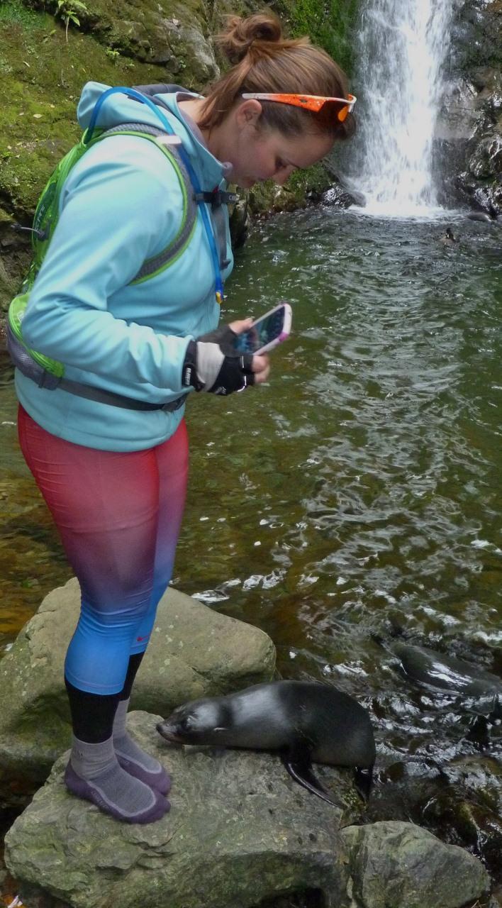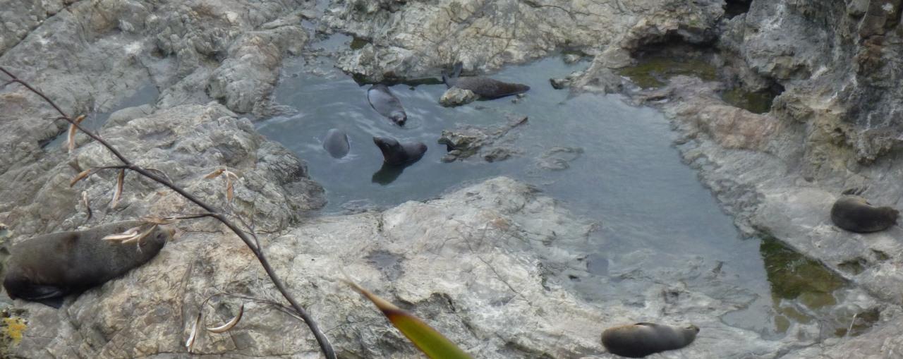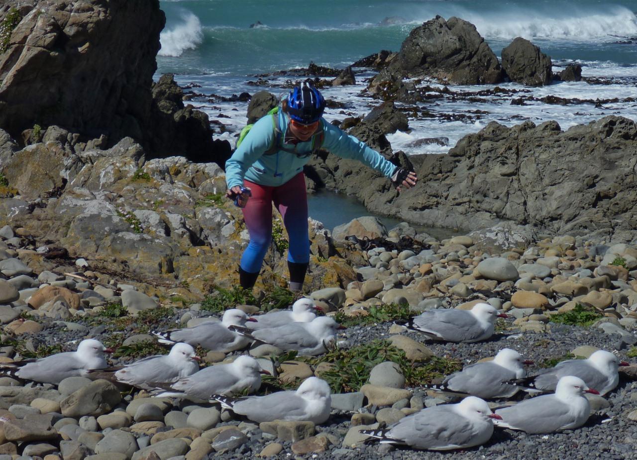 Sandra from Natural High had mentioned that the coast north of Kaikoura was “stunning”. I couldn’t have said it better! We really enjoyed the beautiful mountains to the sea vistas. There was very little traffic so we were able to really enjoy the ride. We stopped at a trailer on the beach for lobster lunch. After that we rode into fur seal country where we hiked about a 1000 feet to a waterfall with a swimming area full of fur seal pups socializing. What a cool spot.