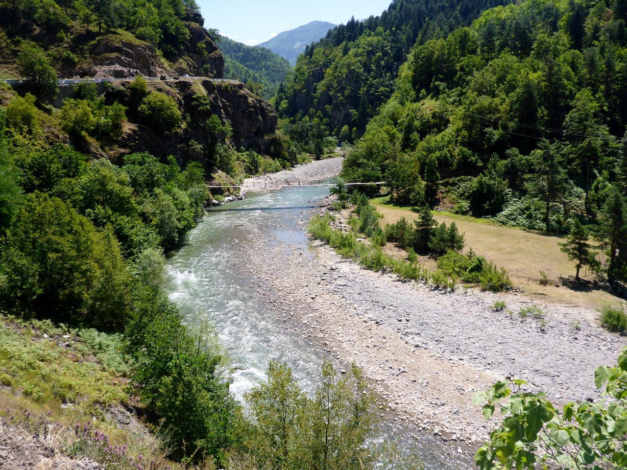 Thursday July 10, 2014 27 miles Breakfast at the local hotels doesn’t start until 9 am so we slept in for this. Then we realized we had reached another time zone somewhere and we had lost an hour. It was a late and hot start for us as we rode out of town and into the local mountains for our trek across Georgia. Cows roam freely here so they were everywhere once we started climbing. Sometimes they move but most times just stand their ground and eat. We soon arrived at a very nice winery and Jocelyn shouted out, “What do you think, dad?” Of course I said yes. We enjoyed tasting some fine Georgian wine then had lunch. The hours ticked by and we stopped for several breaks just to get out of the sun. The miles were coming hard. At another village we stopped for ice cream and asked the proprietor about wine as we wanted to camp early. He told us to continue and Jocelyn was flagged down in front of a river house where we were invited for beer, food, and camping as the proprietor had called ahead to a friend. Our translator was great and we all enjoyed typing in phrases so that we could communicate. At that point we were invited to “camp” inside the house so we brought our bikes in and settled down to the sound of the rushing river below.