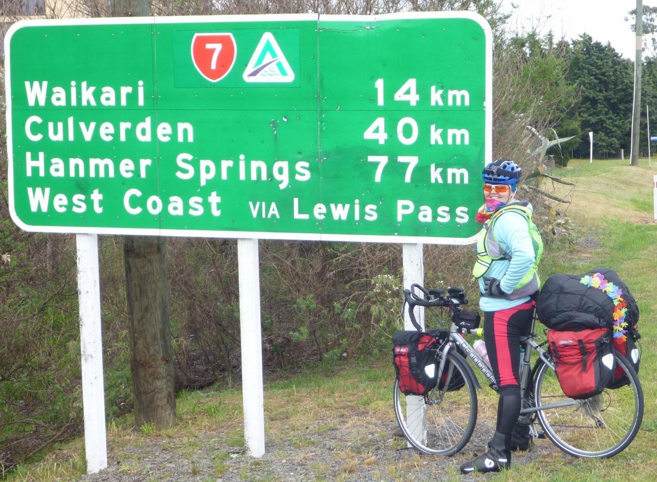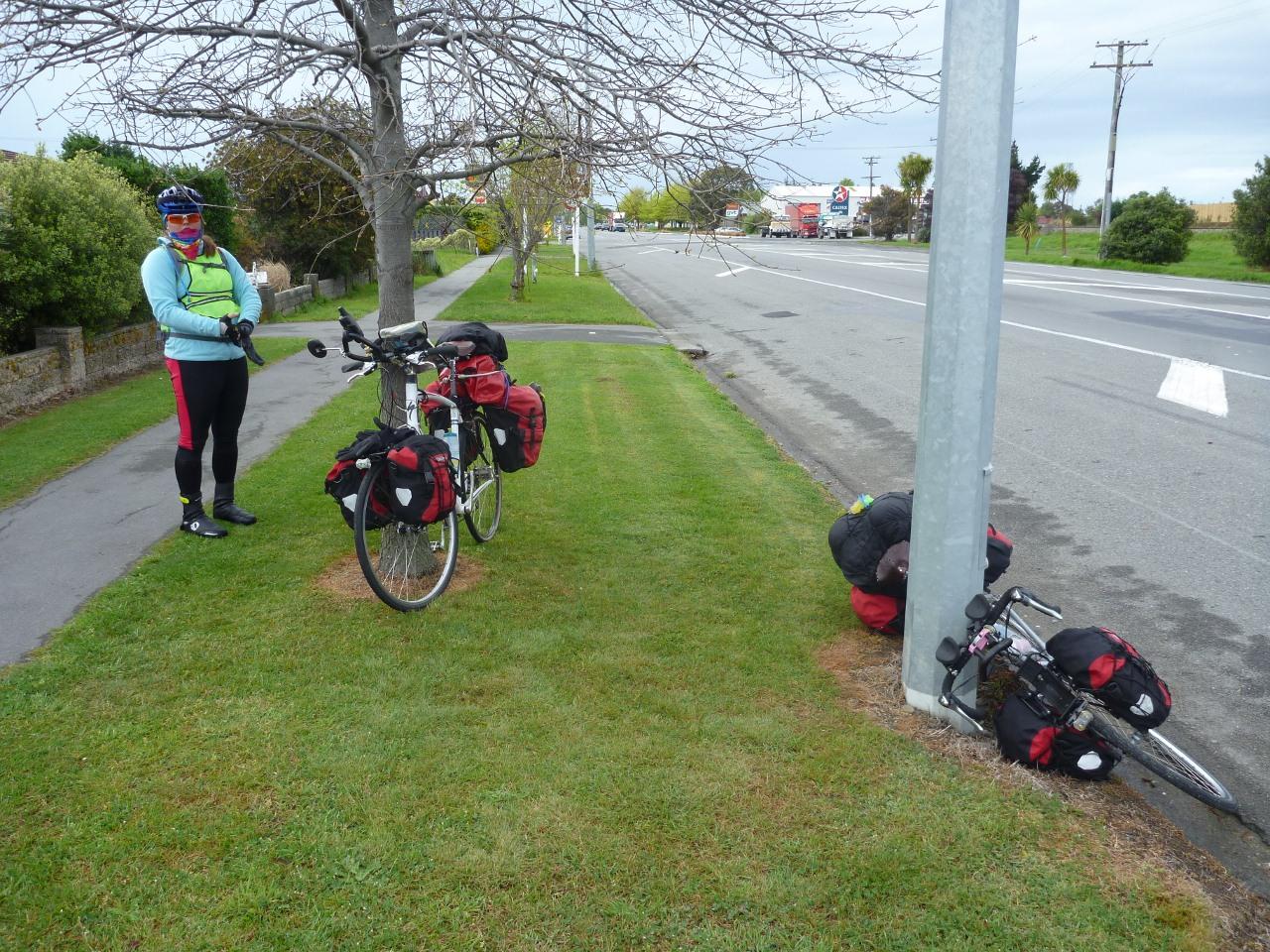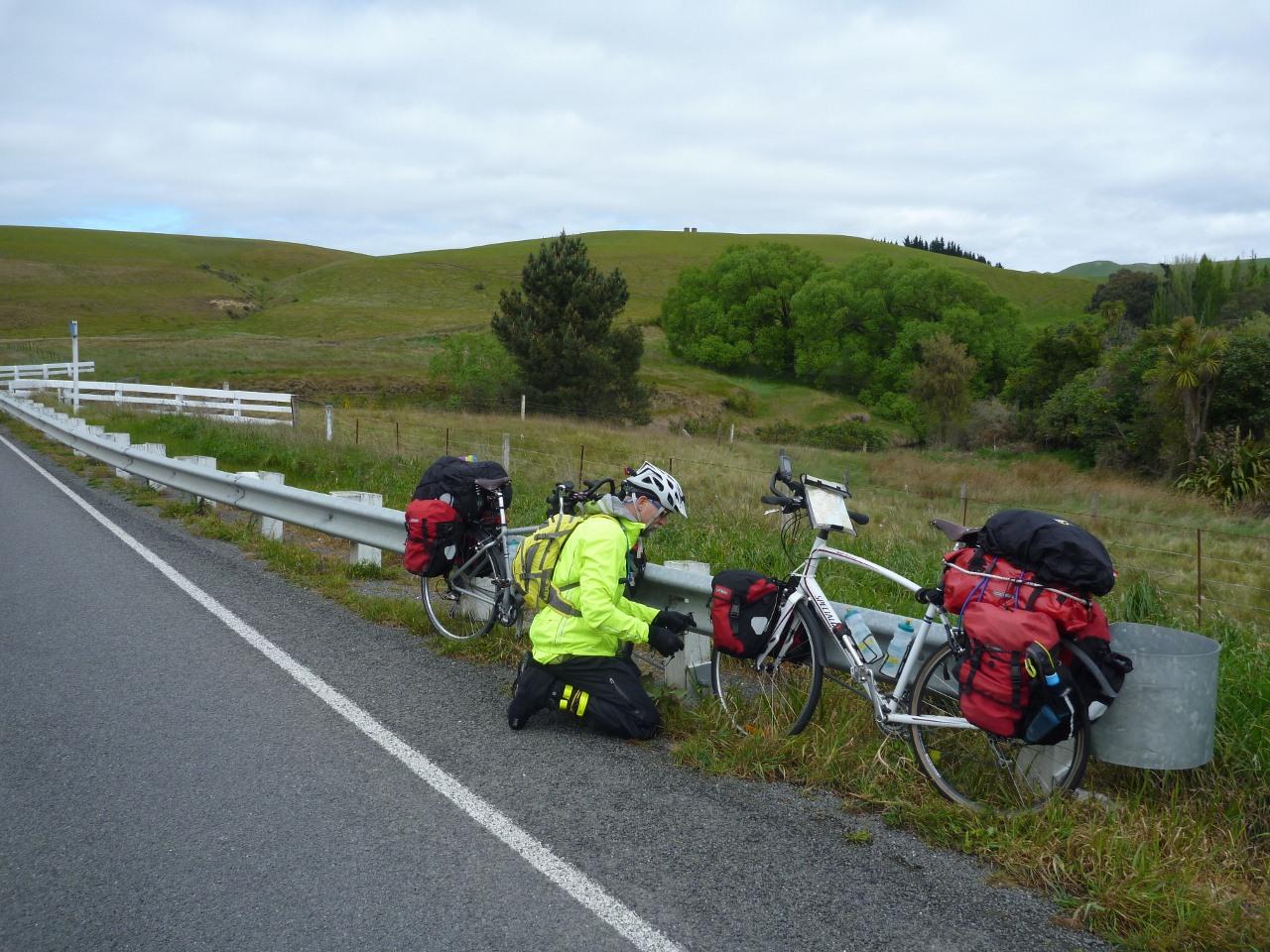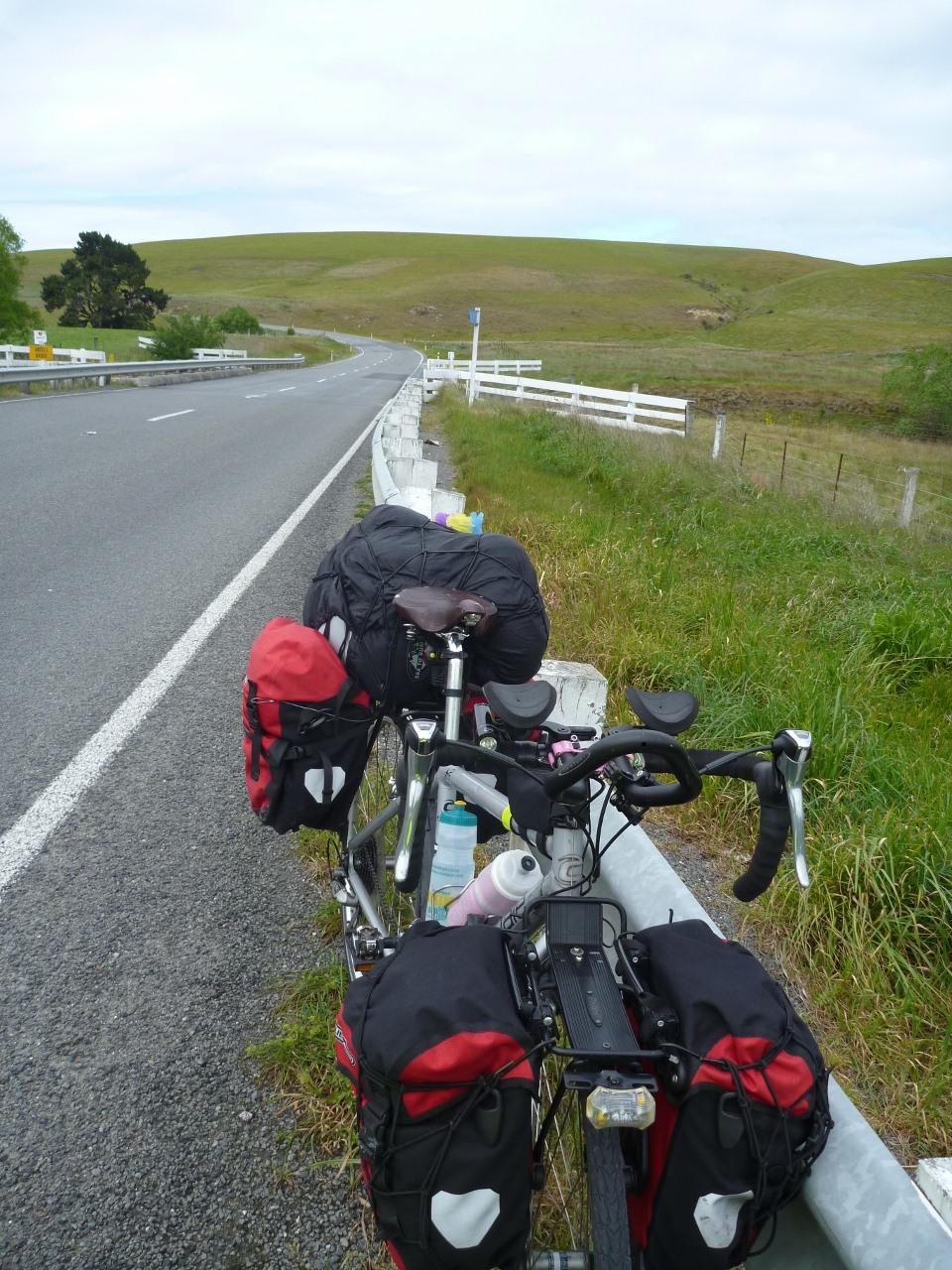 The weather looked good this morning so we were on the road by 7 am. It was cold but that was expected so we dressed appropriately. About a mile out of town I was noticing a noise from the front of my bike so I pulled over. A nice Kiwi gentleman driving by pulled over and asked if we needed help. He said he had tools and would stand by until we were back on the road. The front rack bracket that attaches to the main post had bent and dropped the rack onto the tire. With the Kiwi’s help we were able to bend it back up and I fortunately had several zip ties on hand to strap the rack up to reduce the load on the bracket. He was also going to Hanmer and asked if we would like a lift. I politely declined even though it was very cold and windy. We were back on the road but about 5 miles later the rack again collapsed. At this point I removed the rack along with the weak bracket then reattached the rack legs and the top with zip ties. That did the trick and we were on the road again. We did have several problems with brakes rubbing on the wheels but after several stops and adjustments we continued.