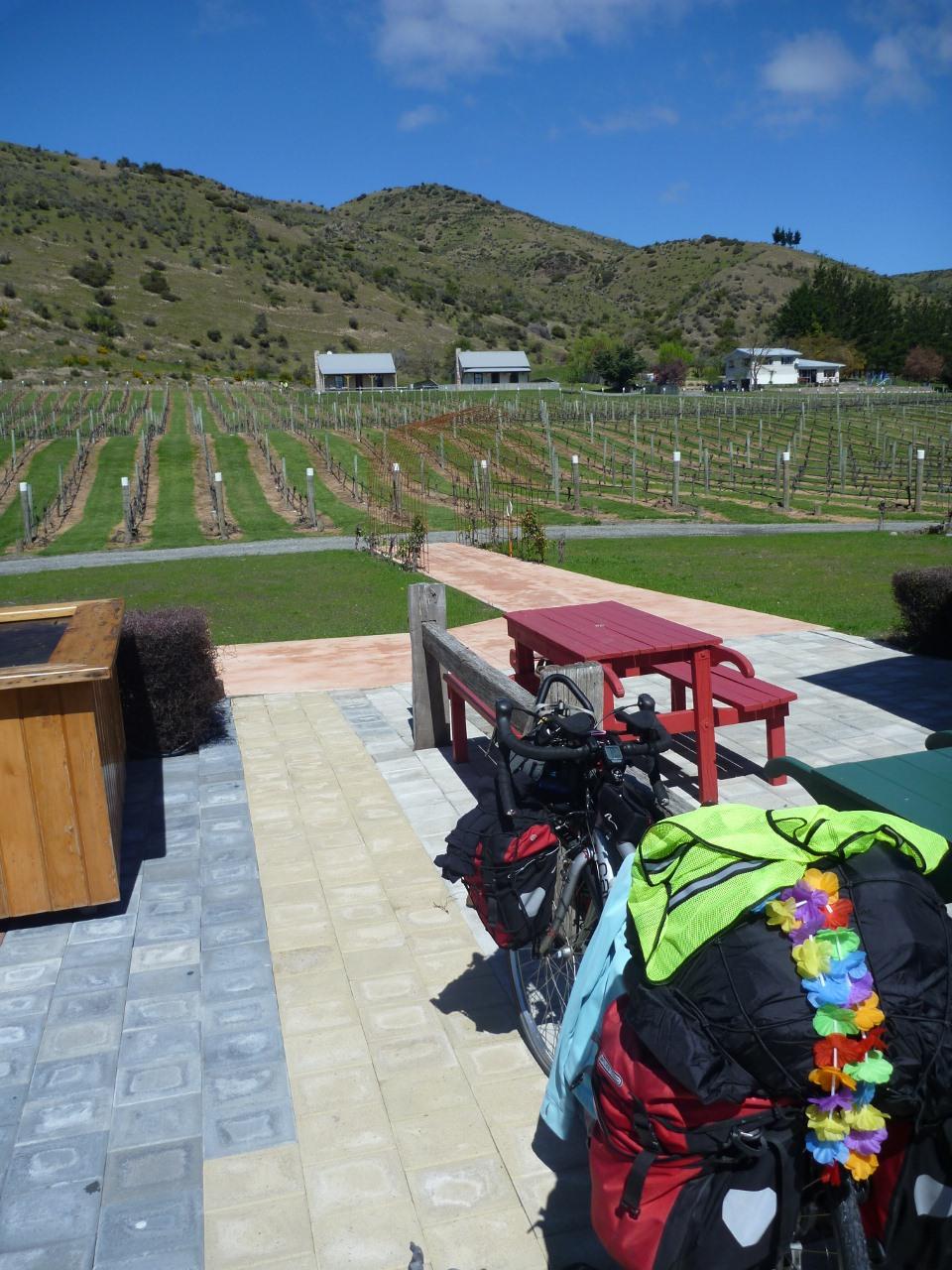 At noon we were in the tiny town of Waikari and stopped at the local pub for a sandwich and fresh milk. After that we continued through the amazing scenery and stopped for a wine tasting at Hurunui Vineyards. At this point we had ridden by many vineyards so we just had to stop. The sun was finally out with no clouds so we stopped and entered the tasting room where we each had four small samples. We then relaxed with a glass of wine along with a bread and dip appetizer. Life is good. We talked with the owner who said he wouldn’t recommend riding to Hanmer today because it is up the hill on a very winding road with weekend traffic but that we should stay in the town of Culverden. I looked at my GPS and found the Culverden Motel and gave them a call. They are in a campground but the manager said it has been freezing the last two nights and unless we were used to the cold their motel room was warmer. I have lived in the Antarctic for the last 8 months but did not have the appropriate clothing to camp in this weather. After purchasing a bottle of the local Pinot Noir we continued onto Culverden. There we got one of the 6 rooms in this cool area, did our laundry in the sink, and laid it outside on chair. We then chilled for the rest of the afternoon. We only rode 35 miles but with at least two hours on the side of the road we did well. Hanmer tomorrow.